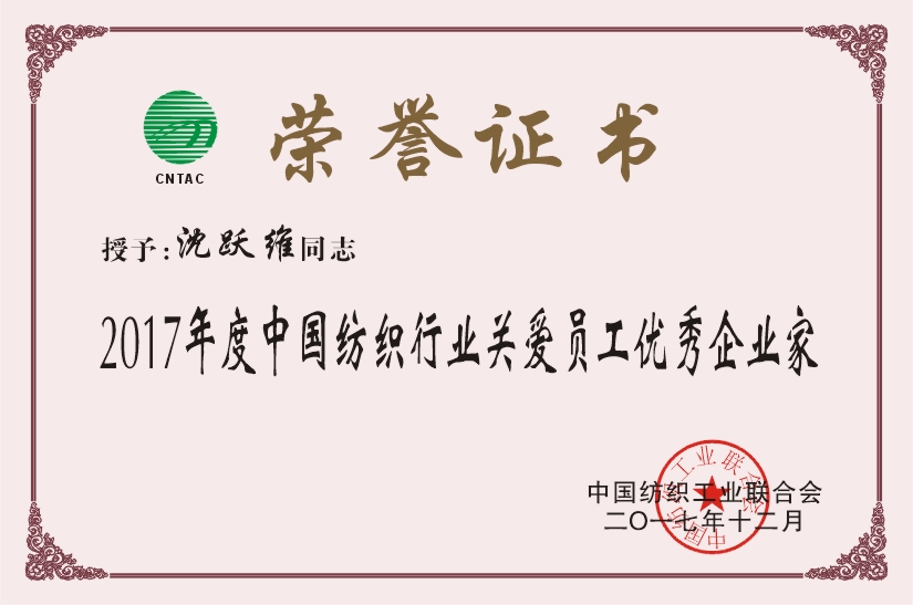 中國(guó)紡織工業(yè)聯(lián)合會(huì)是全國(guó)性的紡織行業(yè)聯(lián)合會(huì),是新時(shí)期中國(guó)紡織工業(yè)有序發(fā)展和與時(shí)俱進(jìn)的綜合協(xié)調(diào)與服務(wù)機(jī)構(gòu),有中國(guó)服裝協(xié)會(huì)、中國(guó)針織工業(yè)協(xié)會(huì)、中國(guó)棉紡織行業(yè)協(xié)會(huì)等幾十家行業(yè)協(xié)會(huì)成員單位。此次,沈總榮獲“中國(guó)紡織行業(yè)關(guān)愛員工優(yōu)秀企業(yè)家”稱號(hào)是平湖唯一一個(gè)獲得這個(gè)獎(jiǎng)項(xiàng)的企業(yè)家。