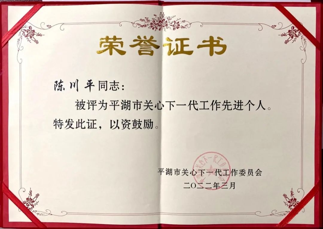 我公司黨委書記、關工委主任陳川平榮獲“平湖市關心下一代工作先進個人”稱號,是平湖經開區(qū)企業(yè)中唯一獲此榮譽的“關工人”。