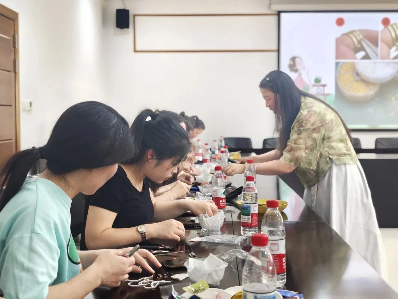 在精彩的講座結(jié)束之后,緊接著是一場沉浸于古典韻味的“非遺壓襟”體驗活動,讓企業(yè)員工們仿佛穿越回古代,領(lǐng)略傳統(tǒng)文化的非凡魅力;顒右潦,佳子老師向員工們深入講解了“壓襟”這一非物質(zhì)文化遺產(chǎn)的起源和制作特色。在制作中,通過佳子老師的悉心指導(dǎo),大家從選擇材料的順序、構(gòu)思設(shè)計到組裝,每一步都充滿了樂趣和挑戰(zhàn)。